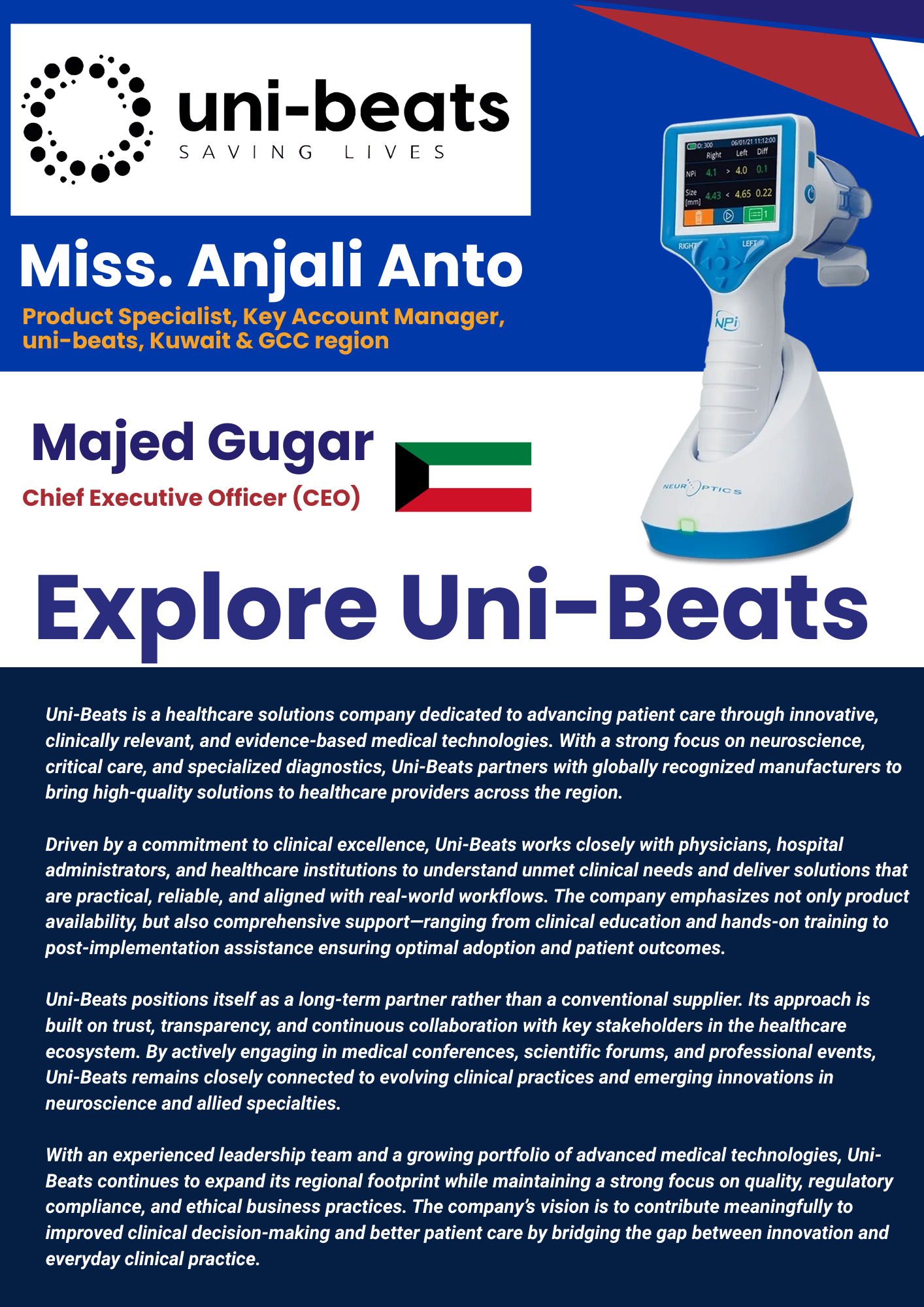 Uni-Beats is a healthcare solutions company dedicated to advancing patient care through innovative, clinically relevant, and evidence-based medical technologies. Specializing in neuroscience, critical care, and specialized diagnostics, the company partners with globally recognized manufacturers to deliver high-quality solutions to healthcare providers across the region.